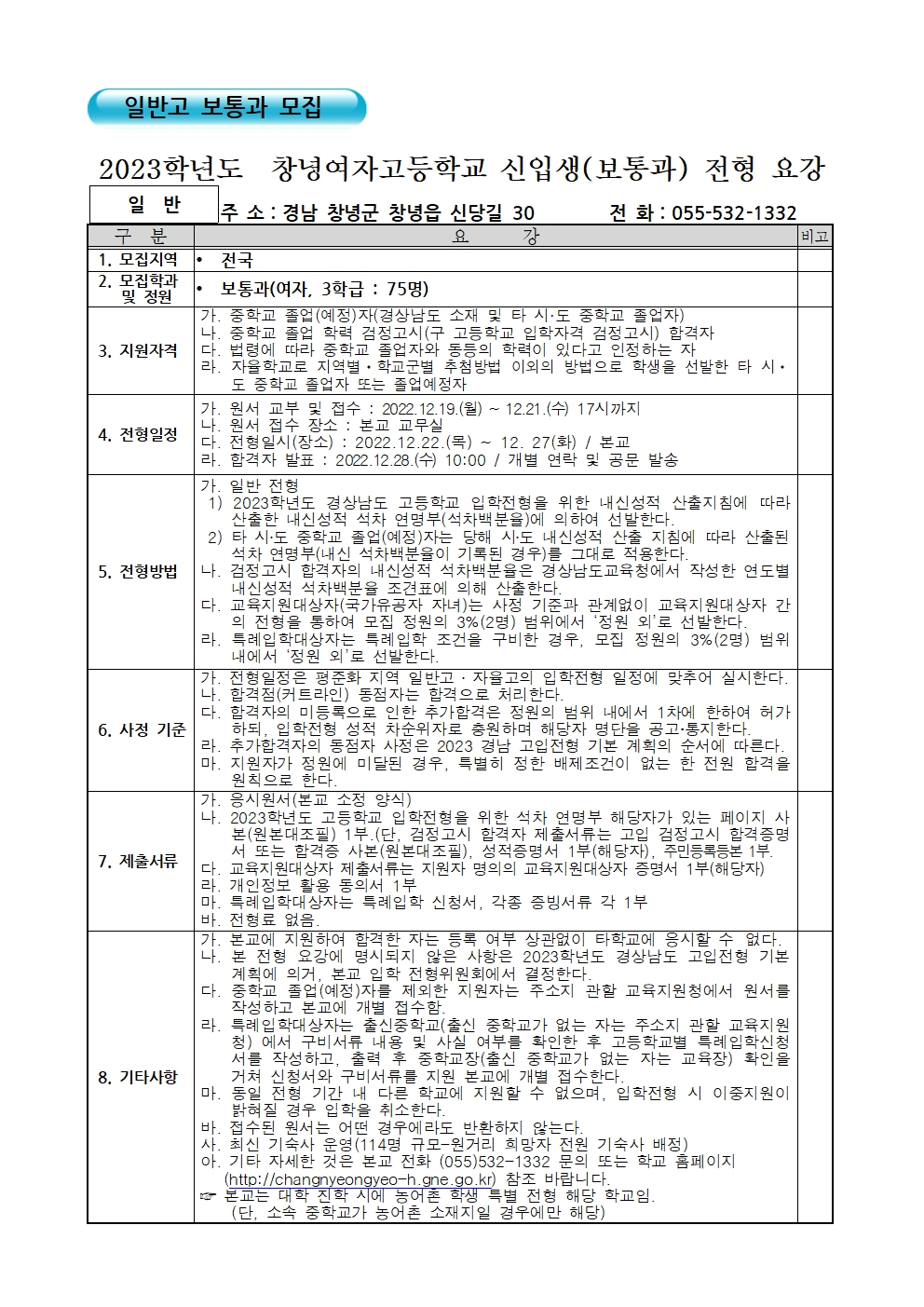 2023학년도 보통과 신입생 모집 요강 및 입학 원서