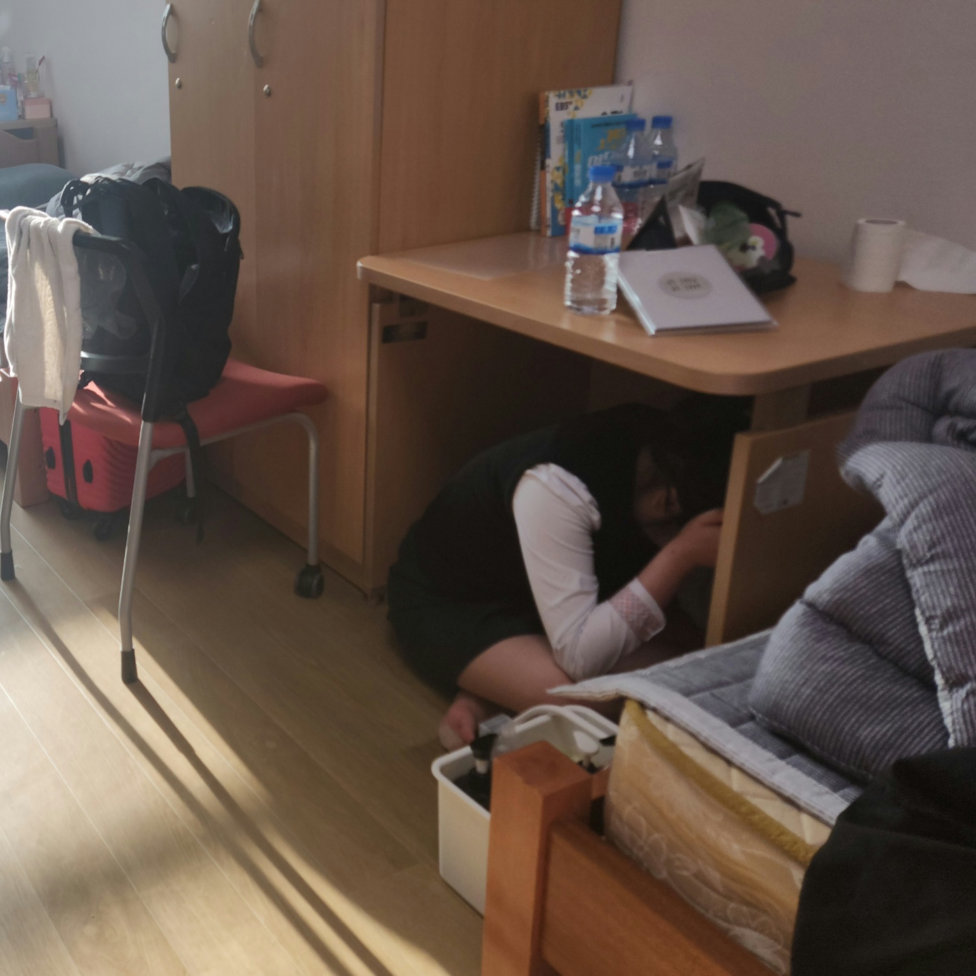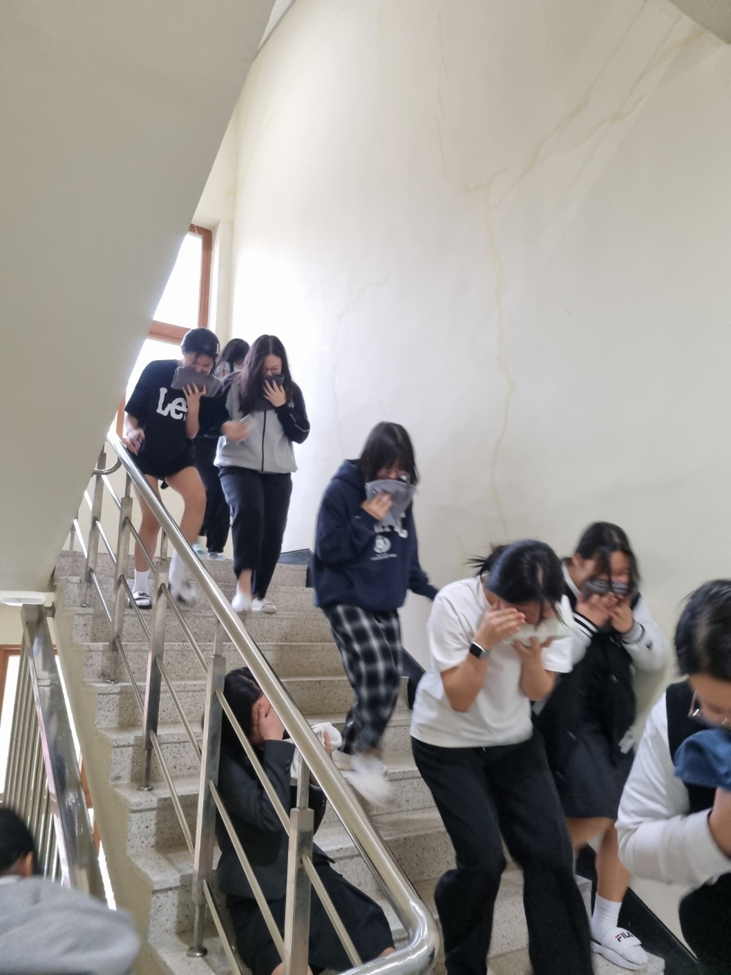 진지한 분위기 속에서 재난 대응 훈련에 참여하여 화재 대피 및 지진 대처 역량을 기름.